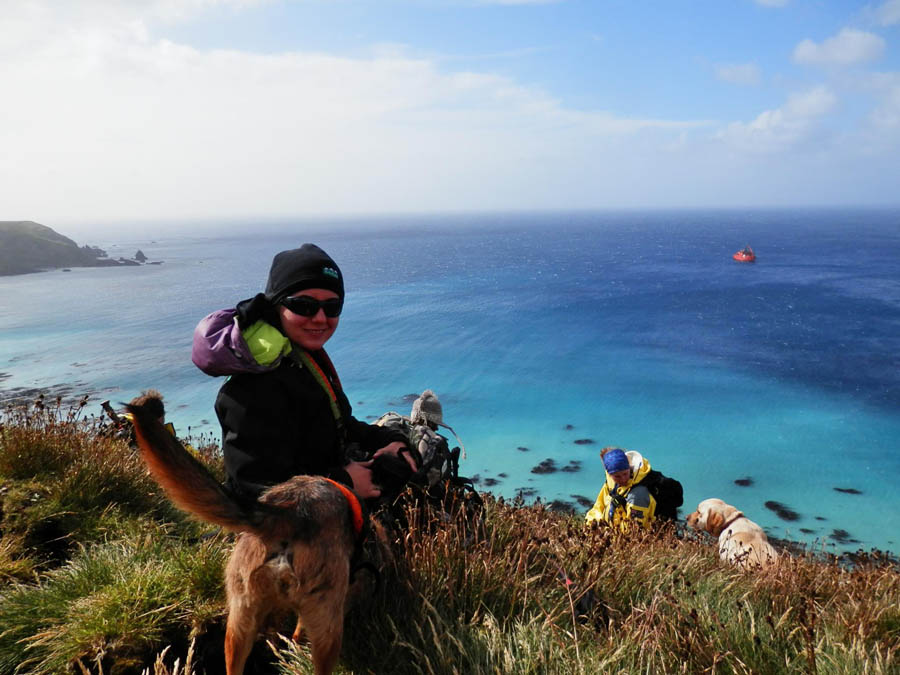 WPS dog handler Leona Plaisier with rat dogs Chase and Bail climbing up the escarpment of Hurd Point, Macquarie Island, with one of the largest known colonies of Royal penguins in the background.